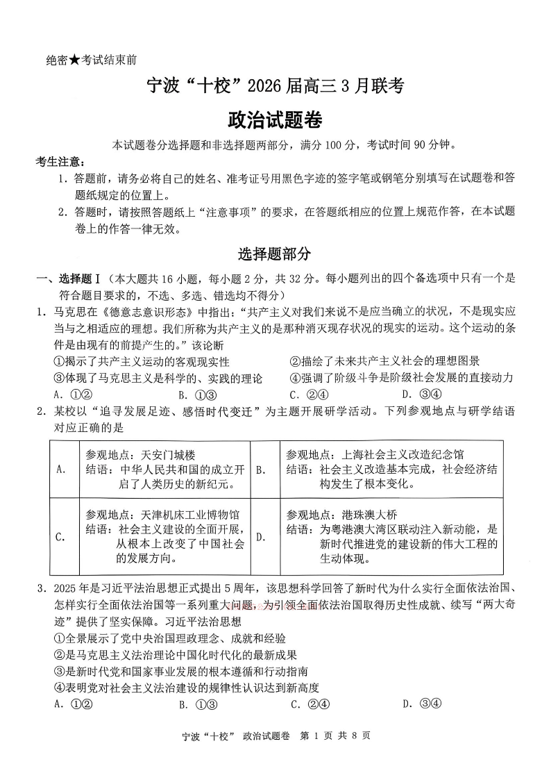 浙江省宁波十校2026届高三年级3月联考 政治.pdf