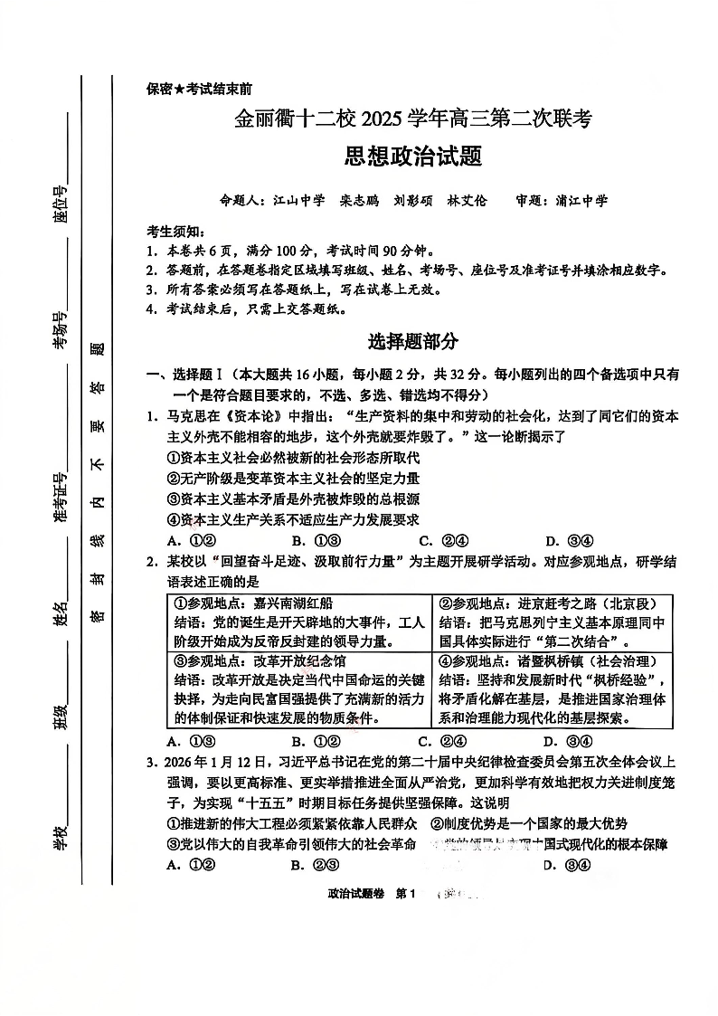 金丽衢十二校2025-2026学年度高三年级第二次联考 政治.pdf