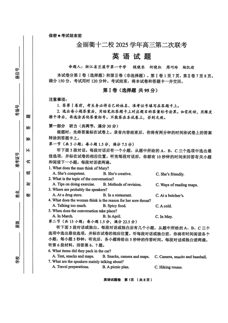金丽衢十二校2025-2026学年度高三年级第二次联考 英语.pdf