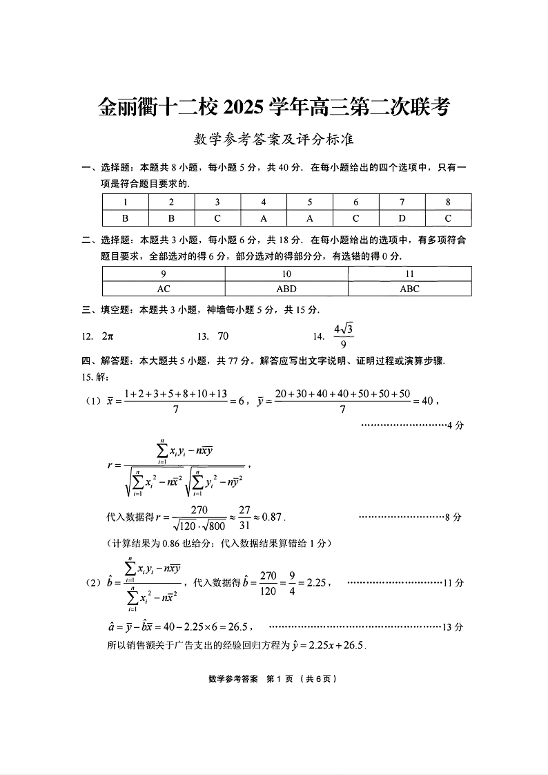 金丽衢十二校2025-2026学年度高三年级第二次联考 数学答案.pdf