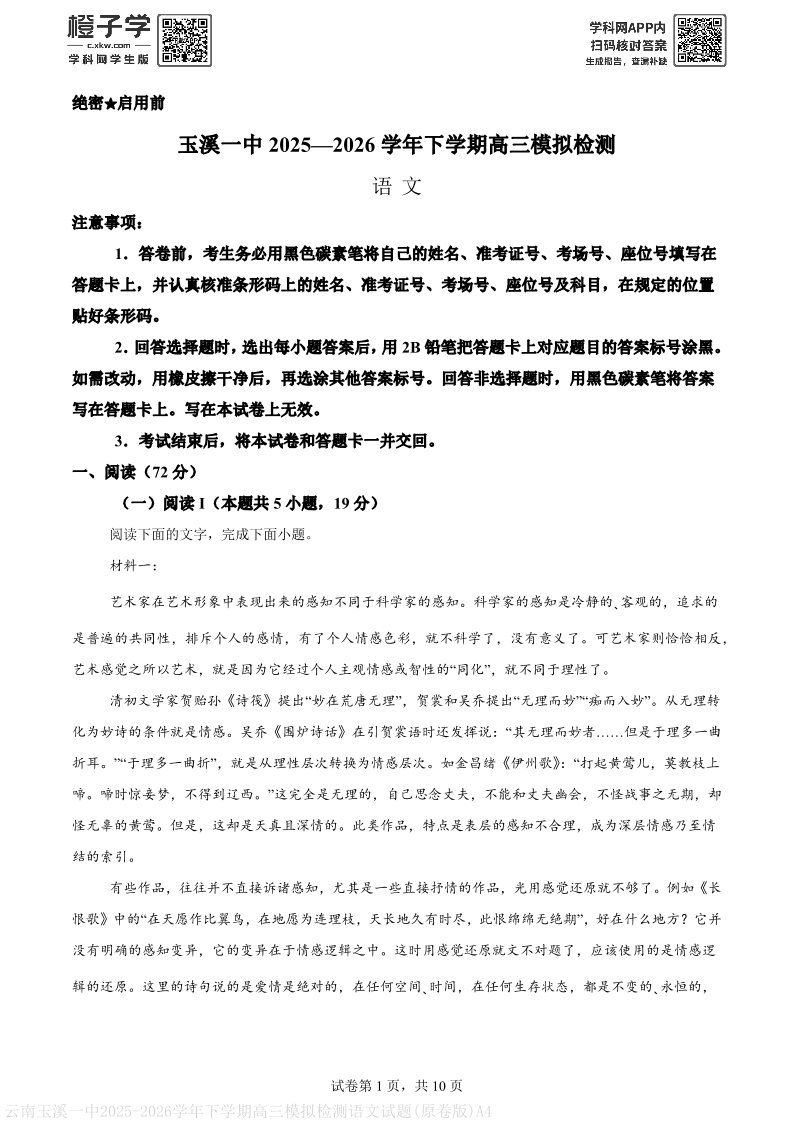 云南省玉溪第一中学2026届高三下学期3月模拟预测 语文.pdf