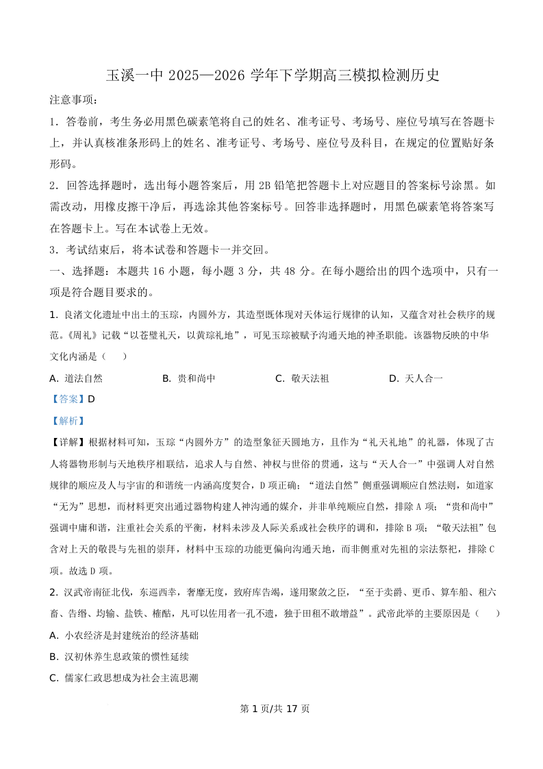 云南省玉溪第一中学2026届高三下学期3月模拟预测 历史答案.docx