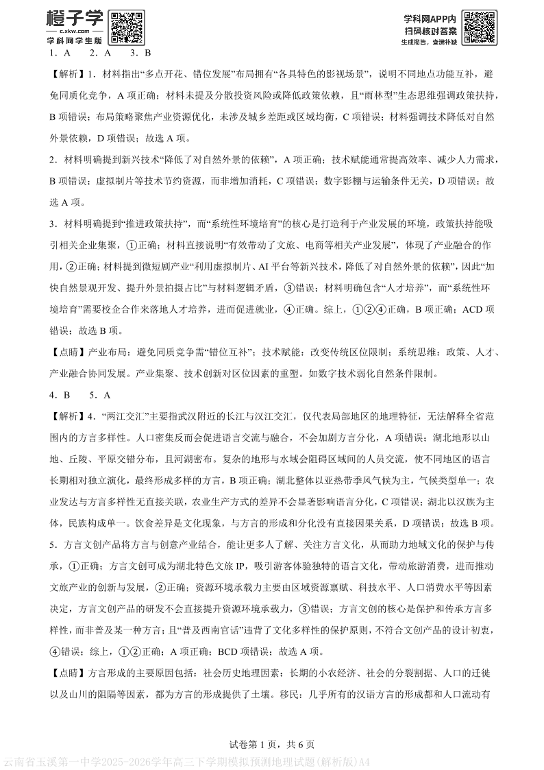 云南省玉溪第一中学2026届高三下学期3月模拟预测 地理答案.pdf