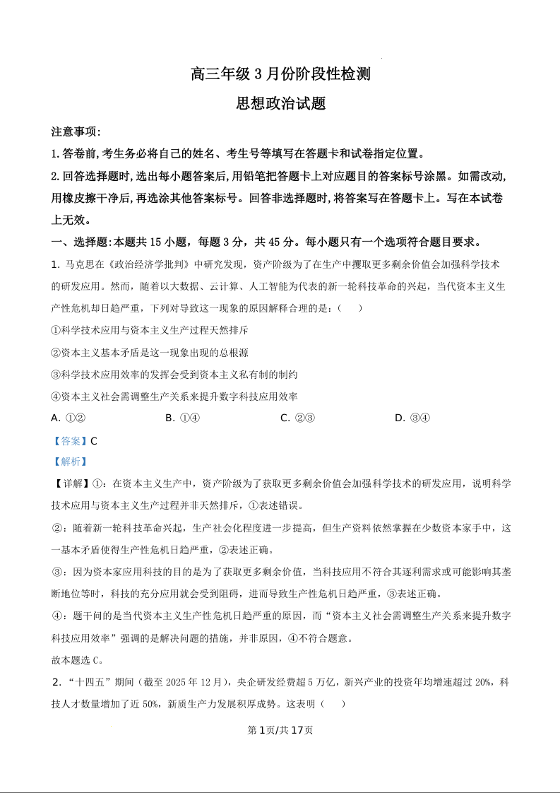 山东师范大学附属中学2026届高三下学期3月阶段检测 政治答案.docx