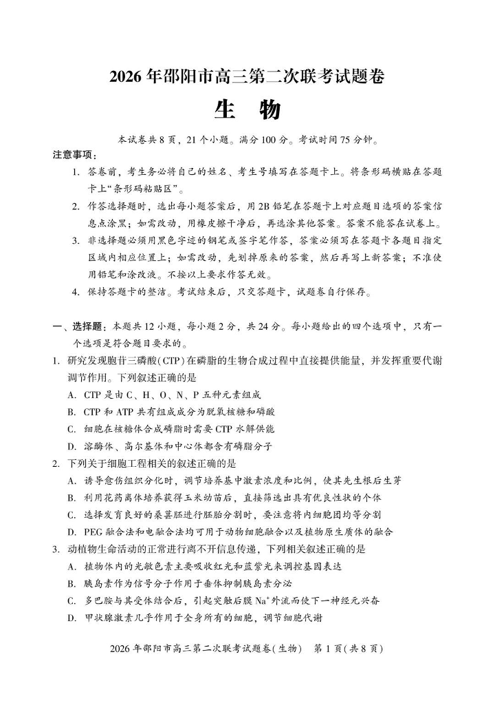 2026年邵阳市高三第二次联考试题卷 生物试题(含答案).pdf