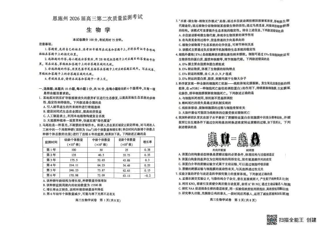 恩施州2026届高三第二次质量监测考试 生物.pdf
