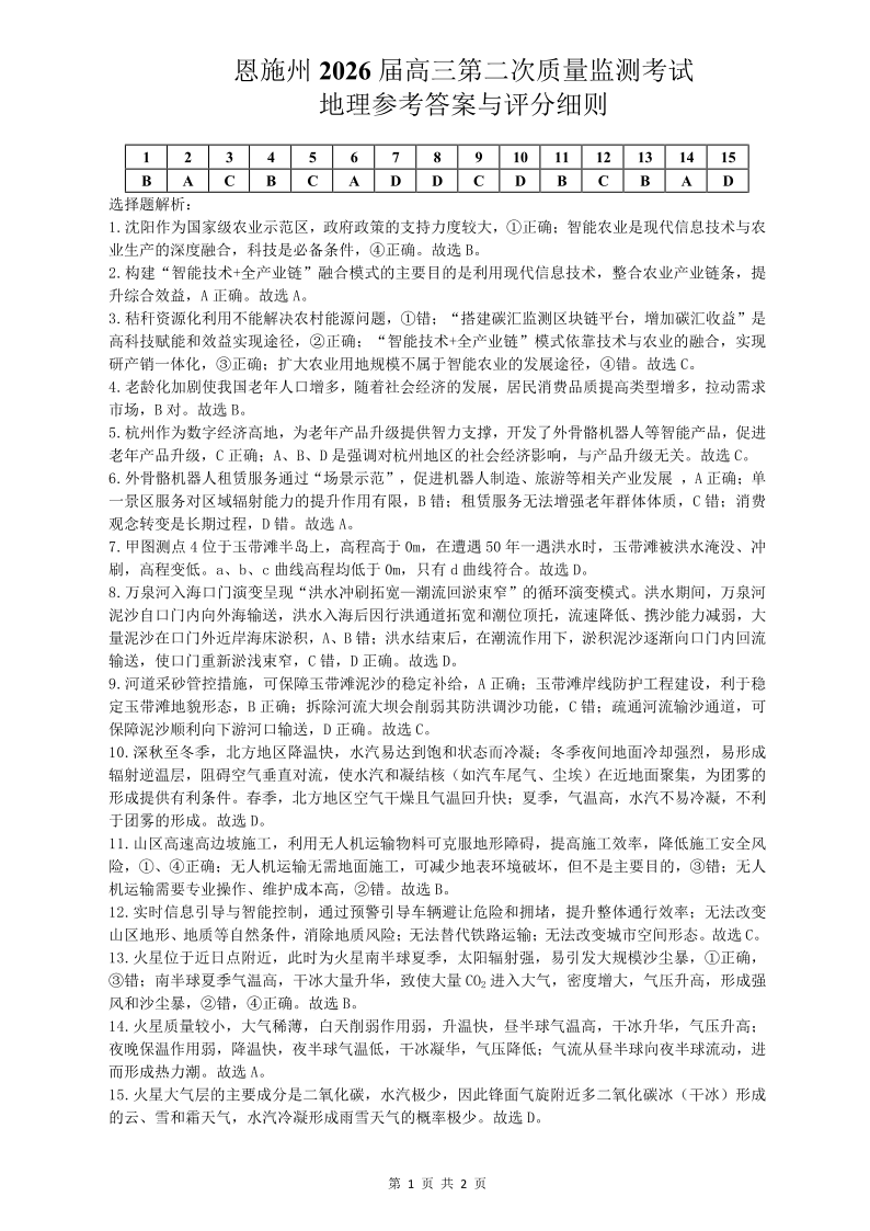 恩施州2026届高三第二次质量监测考试 地理答案.pdf