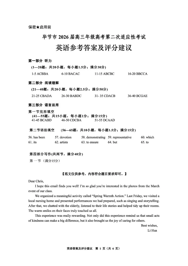 毕节市2026届高三年级高考第二次适应性考试 英语答案.pdf