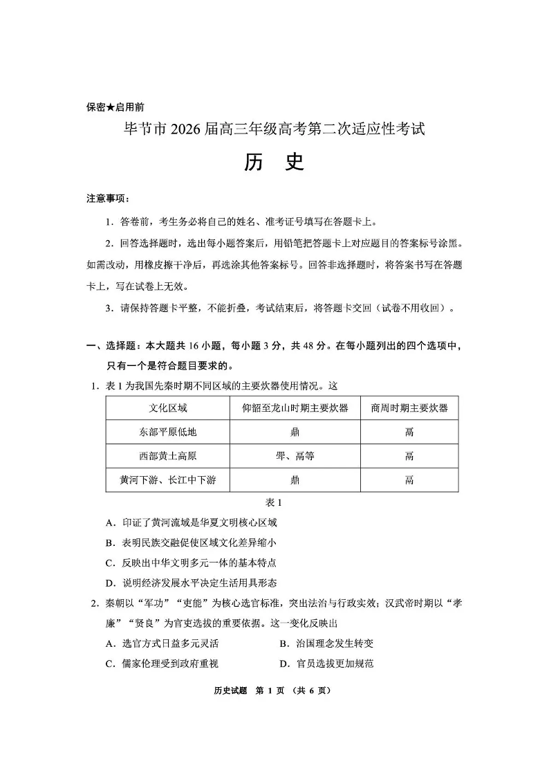毕节市2026届高三年级高考第二次适应性考试 历史.pdf
