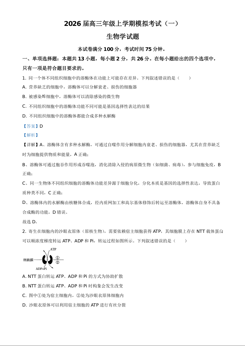 河北省名校协作体2026届高三上学期模拟考试(一)生物答案.docx