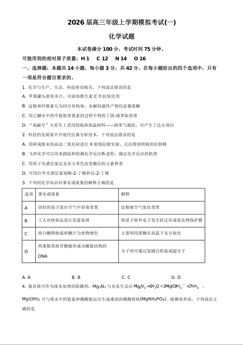河北省名校协作体2026届高三上学期模拟考试(一)化学.docx