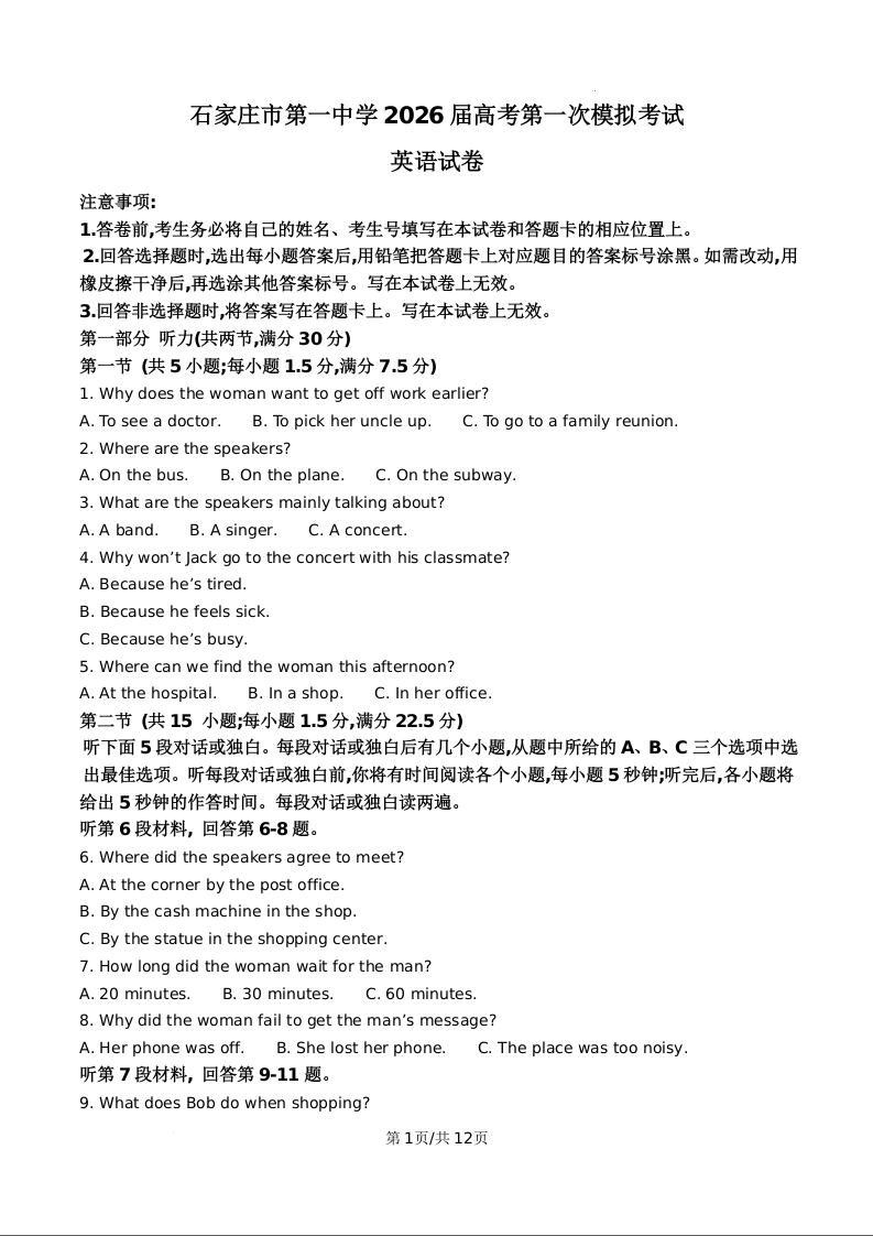 河北石家庄市第一中学2026届高三高考第一次模拟考试 英语.docx