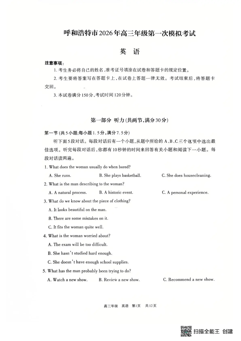 呼和浩特市2026年高三年级第一次模拟考试 英语.pdf