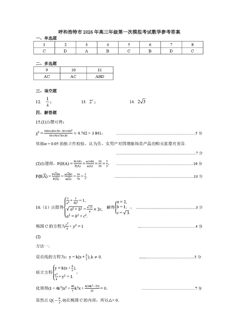 呼和浩特市2026年高三年级第一次模拟考试 数学答案.pdf