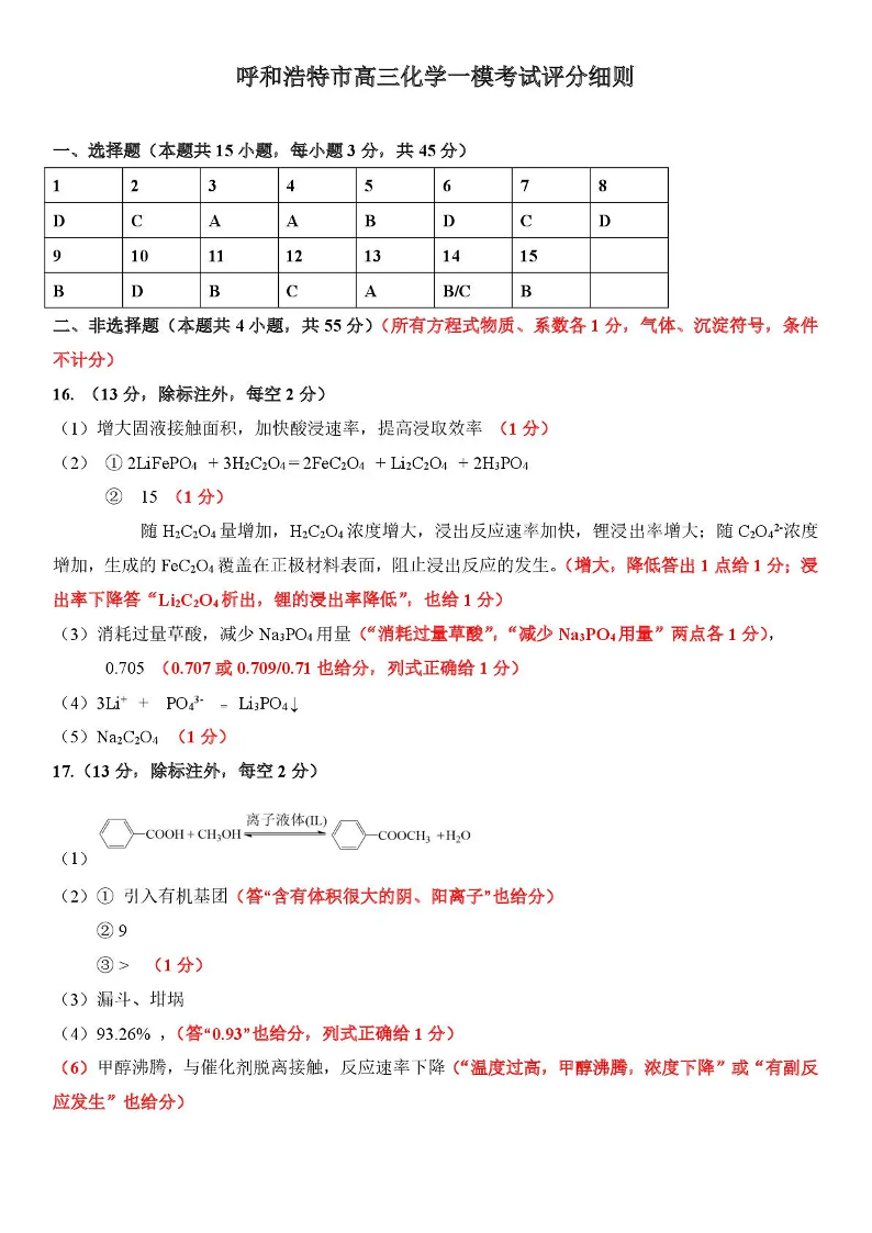 呼和浩特市2026年高三年级第一次模拟考试 化学答案.pdf