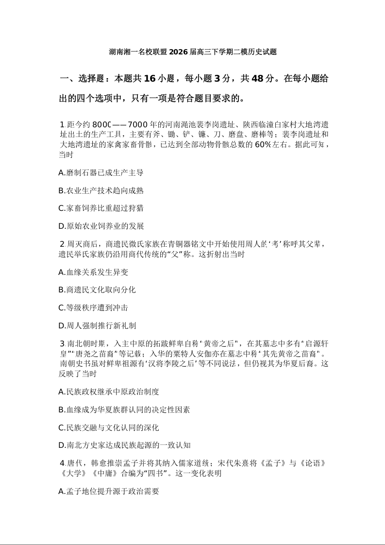 湘一名校联盟2026届高三下学期3月质量检测 历史.docx