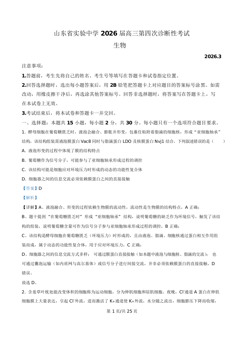 山东省实验中学2026届高三第四次诊断性考试 生物答案.docx