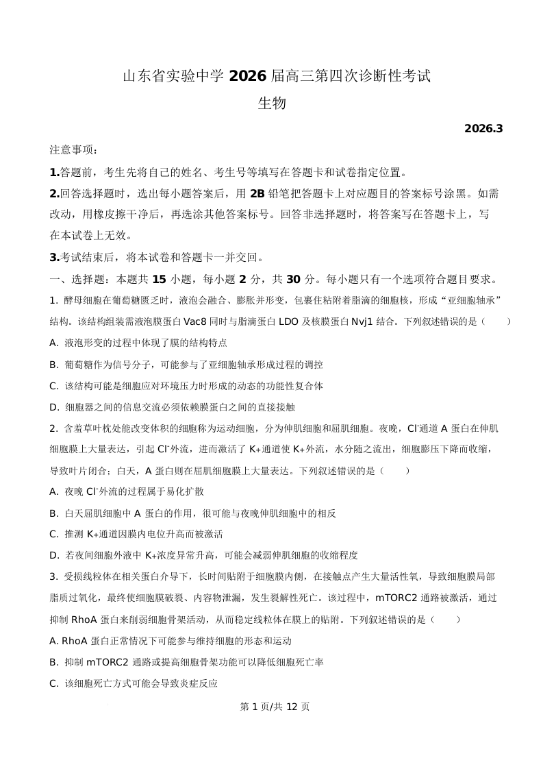 山东省实验中学2026届高三第四次诊断性考试 生物.docx