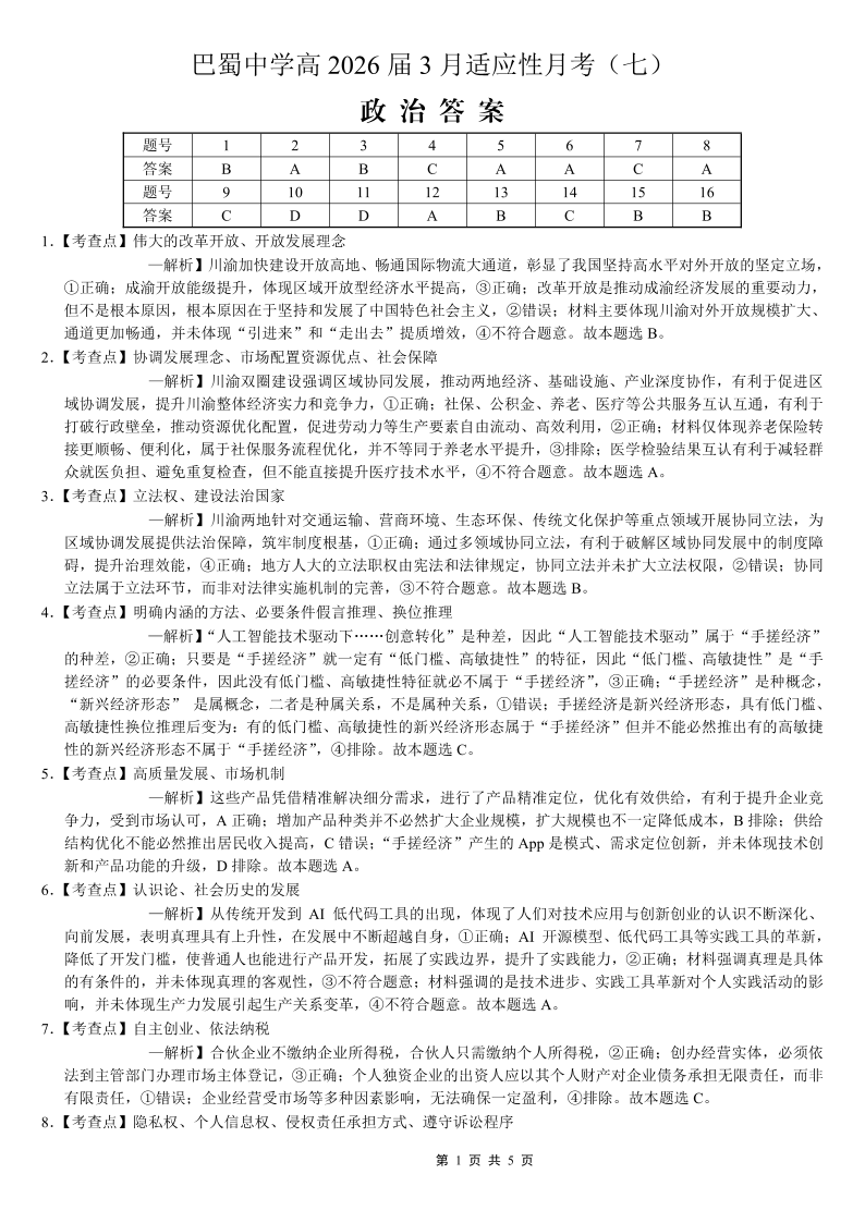 巴蜀中学2026届高考适应性月考卷(七)政治答案.pdf