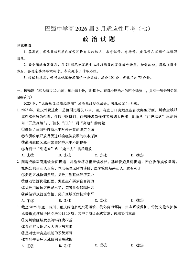巴蜀中学2026届高考适应性月考卷(七)政治.pdf