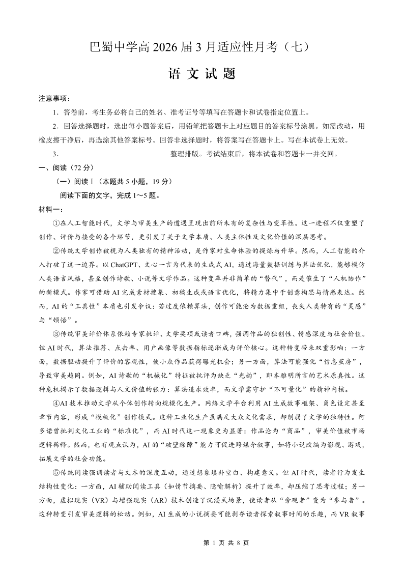 巴蜀中学2026届高考适应性月考卷(七)语文.pdf