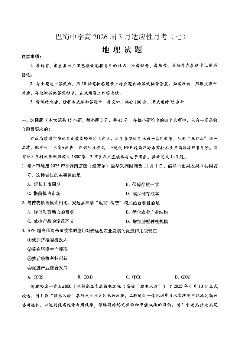 巴蜀中学2026届高考适应性月考卷(七)地理.pdf