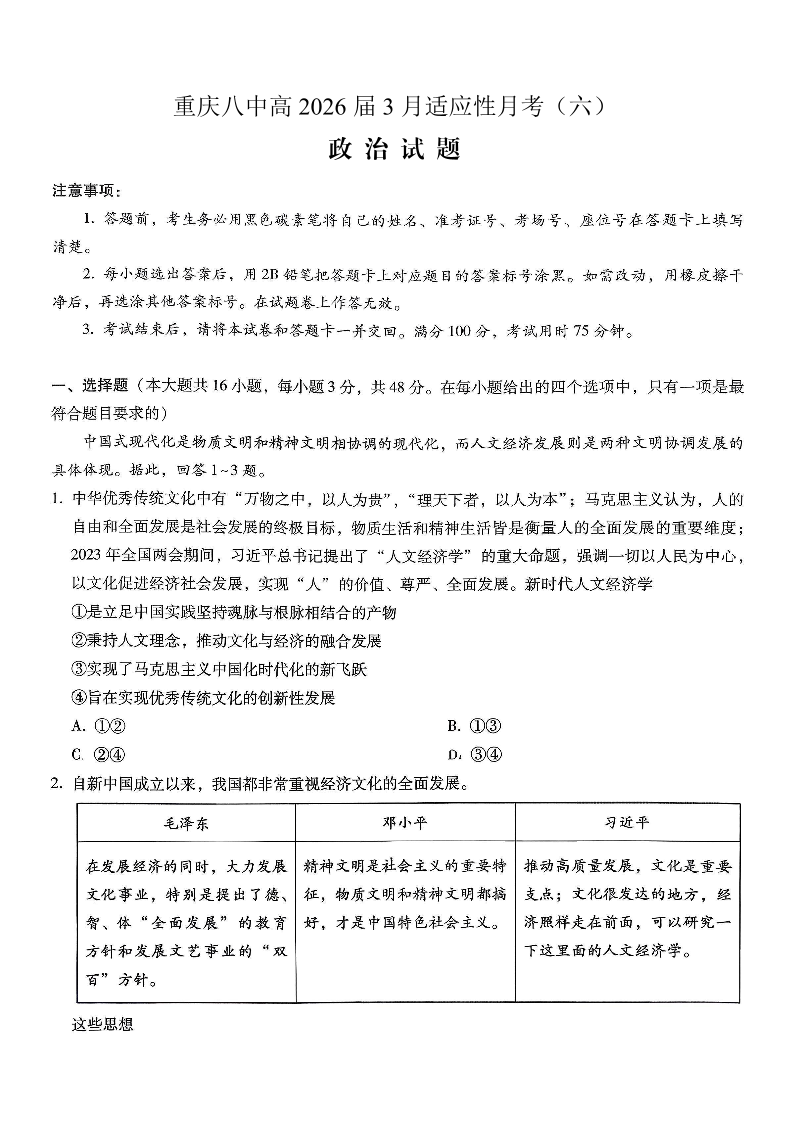 重庆市第八中学2026届高考适应性月考卷(六)政治.pdf