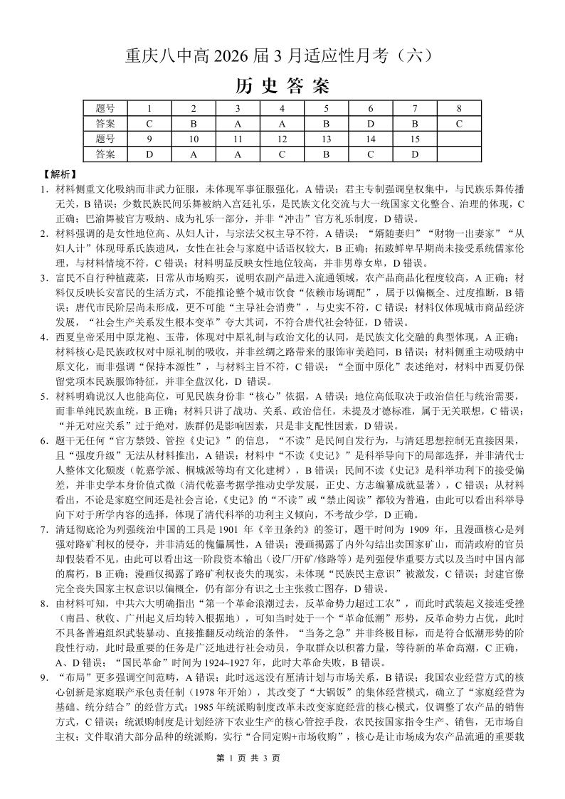 重庆市第八中学2026届高考适应性月考卷(六)历史答案.pdf
