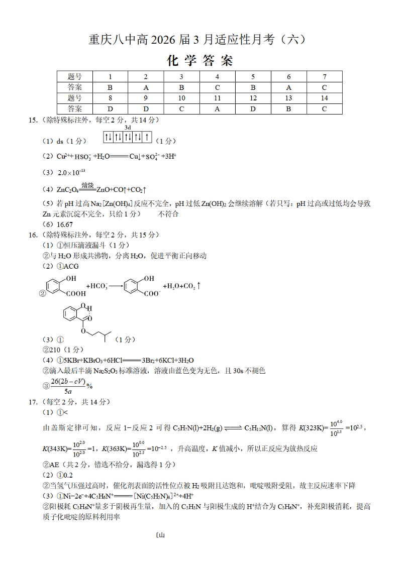 重庆市第八中学2026届高考适应性月考卷(六)化学答案.pdf