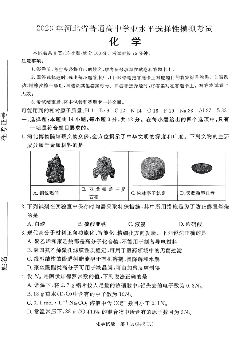 2026年河北省普通高中学业水平选择性模拟考试 化学试题(含答案).pdf