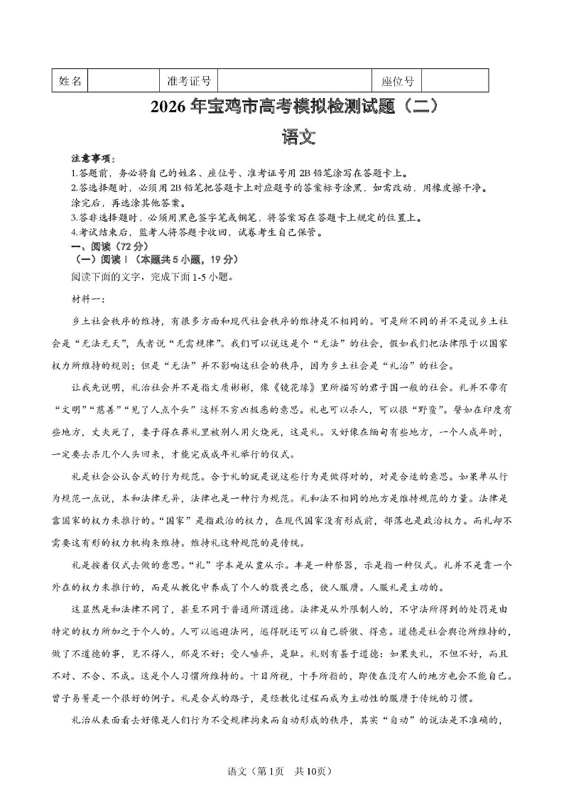 2026年宝鸡市高考模拟检测试题(二)语文.pdf