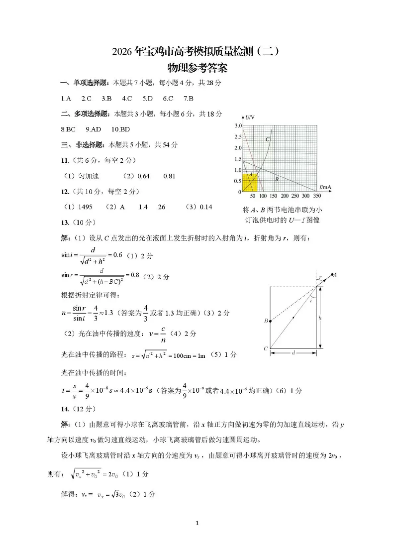 2026年宝鸡市高考模拟检测试题(二)物理答案.pdf