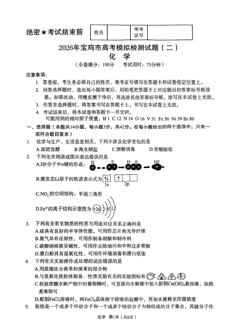 2026年宝鸡市高考模拟检测试题(二)化学.pdf