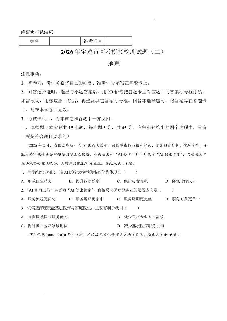 2026年宝鸡市高考模拟检测试题(二)地理.pdf