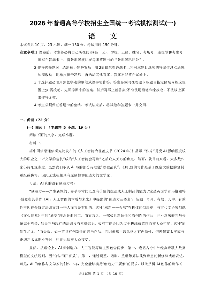 2026年普通高等学校招生全国统一考试模拟测试(一)语文.docx