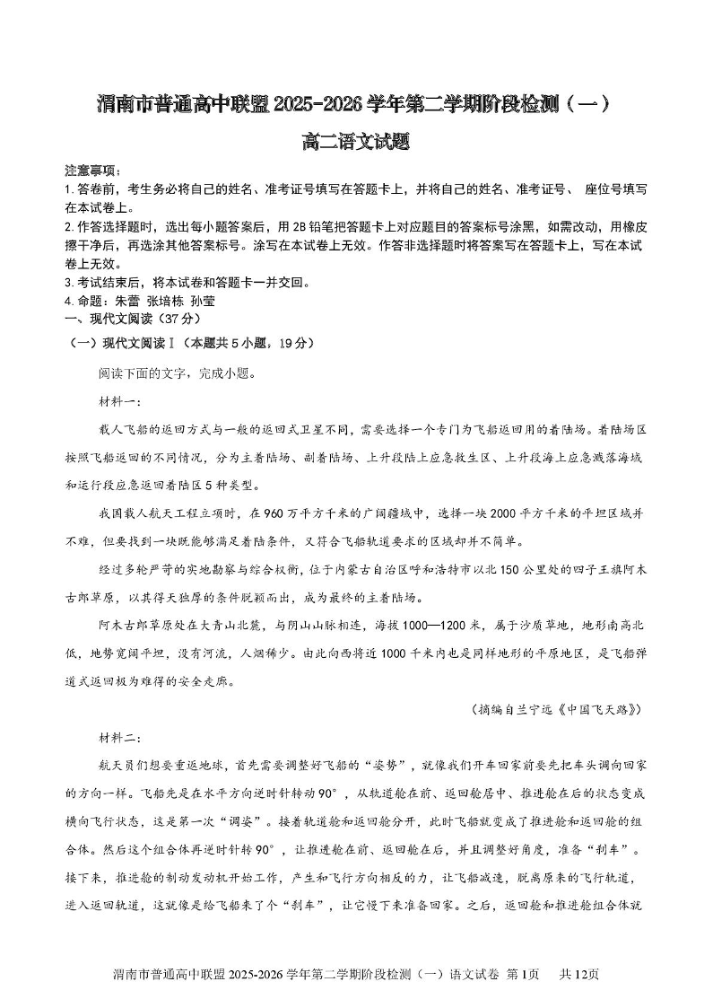 陕西省渭南市普通高中联盟2025-2026学年高二第二学期阶段性检测(一)语文.pdf