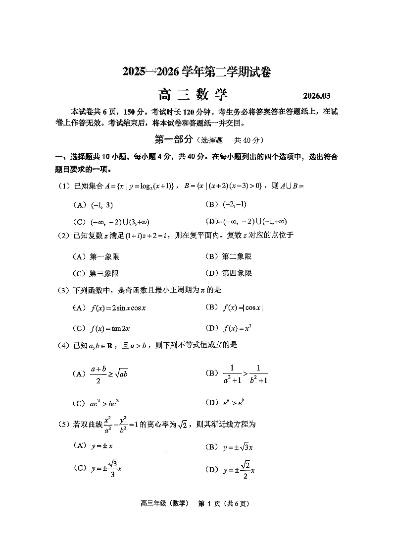 北京市延庆区2025-2026学年第二学期高三年级考试 数学试题(含答案).pdf
