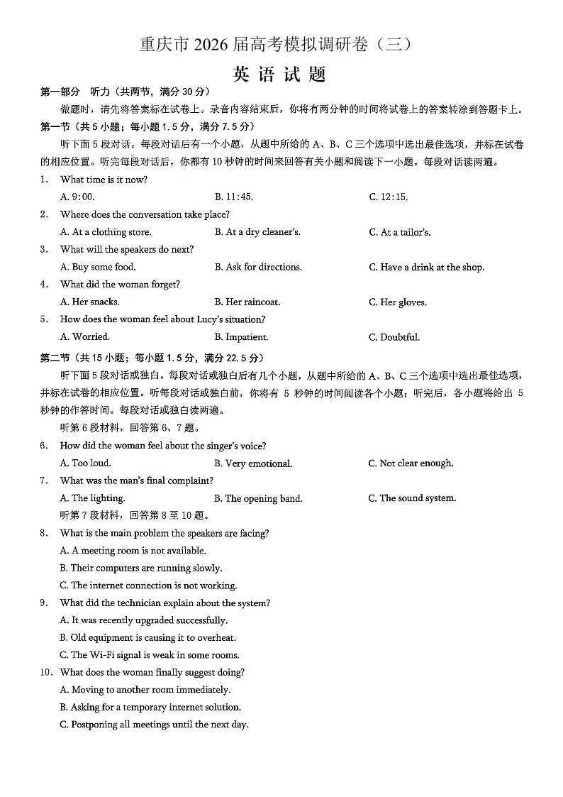 重庆市2026年普通高等学校招生全国统一考试康德调研(三)英语试题(含答案).pdf