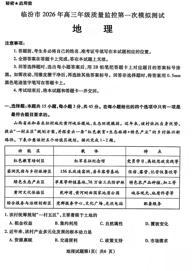 临汾市2026年高三年级质量监控第一次模拟测试 地理.pdf