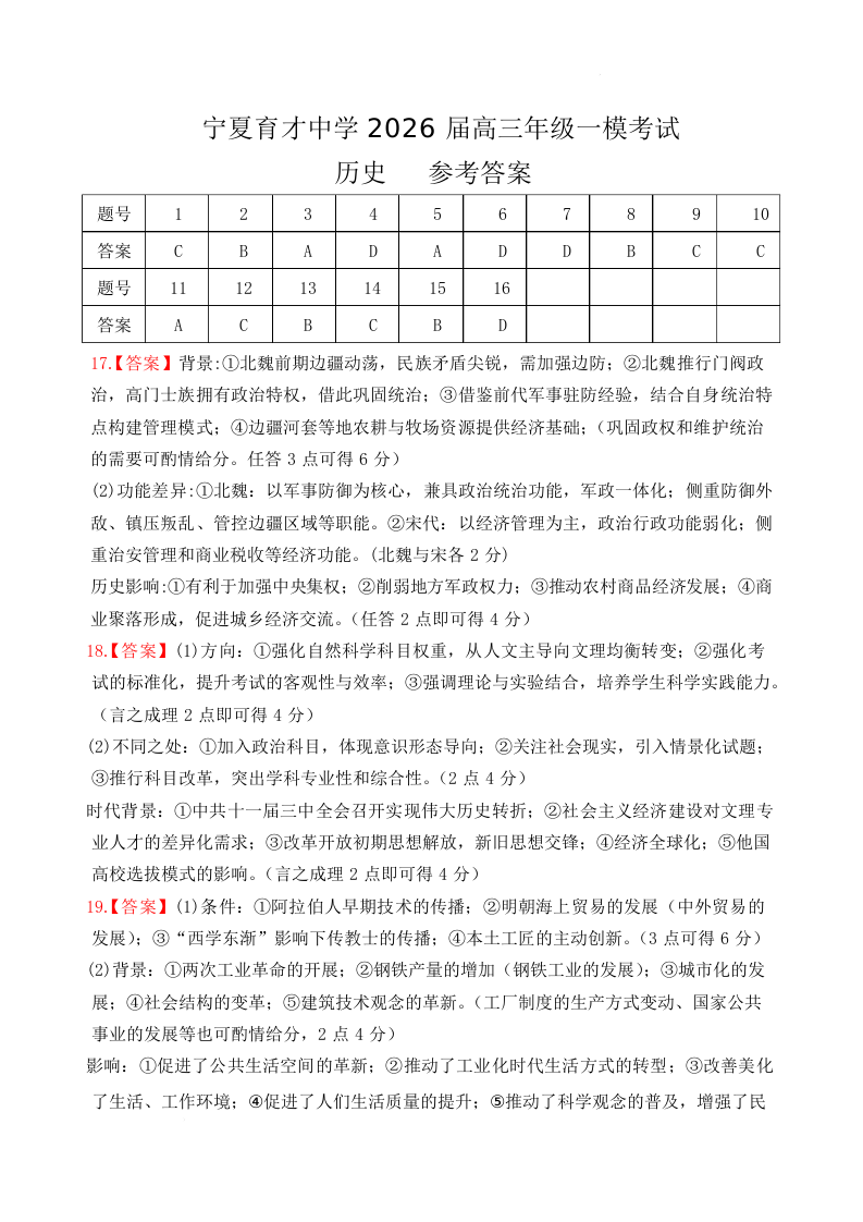 宁夏育才中学2026届高三年级一模考试 历史答案.docx