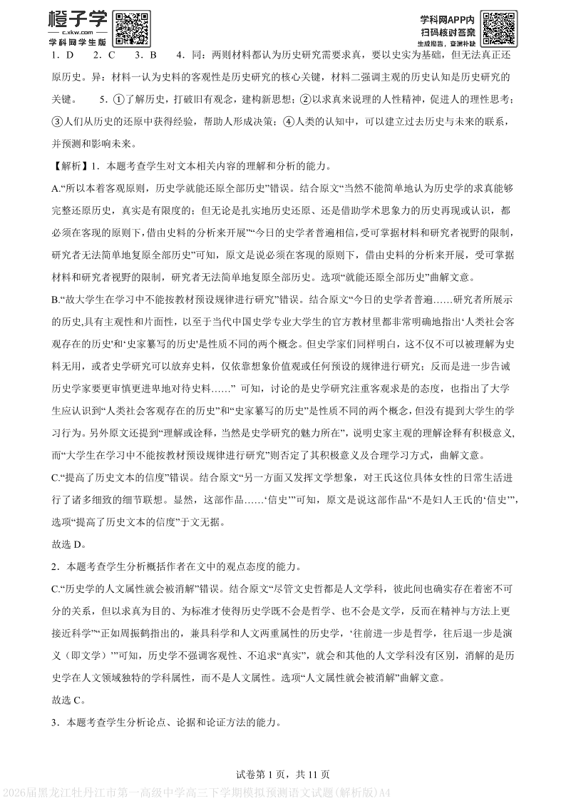 黑龙江牡丹江市第一高级中学2026届高三下学期阶段性测试 语文答案.pdf