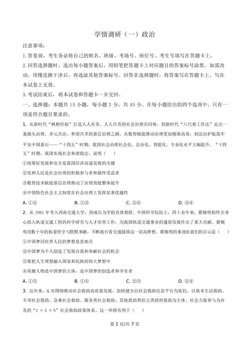 河南省开封高级中学2026届高三下学期学情调研(一)政治.docx