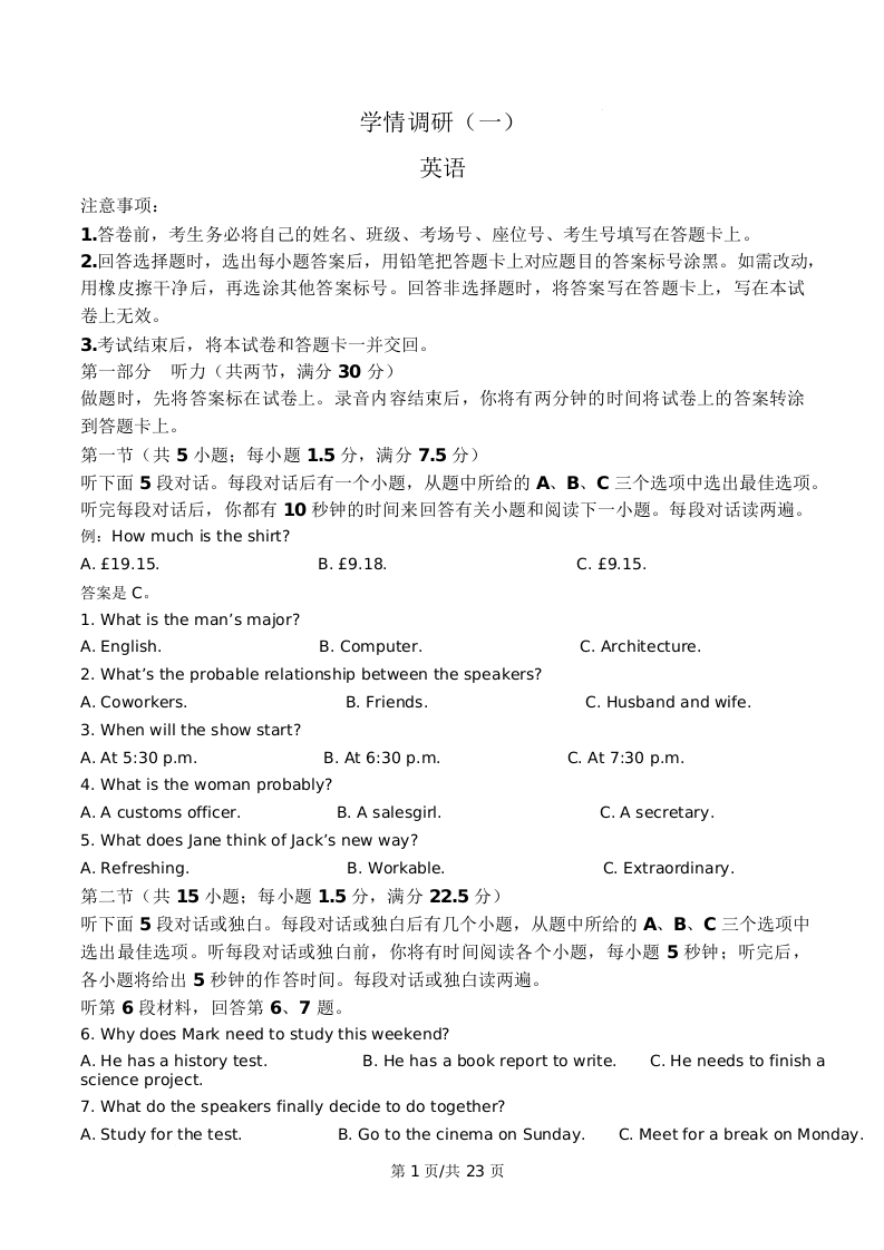 河南省开封高级中学2026届高三下学期学情调研(一)英语答案.docx