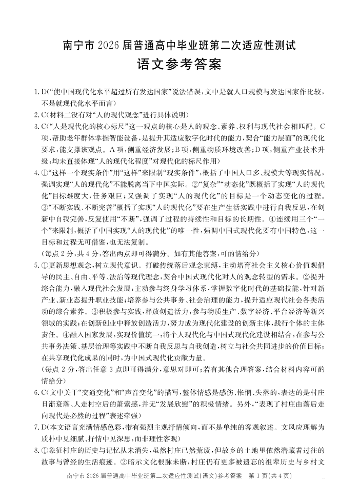 南宁市2026届普通高中毕业班第二次适应性测试 语文答案.pdf