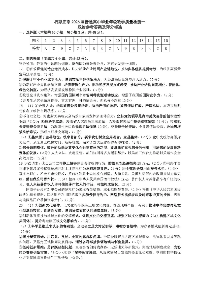 2026届石家庄市普通高中学校毕业年级教学质量检测(一)政治答案.pdf