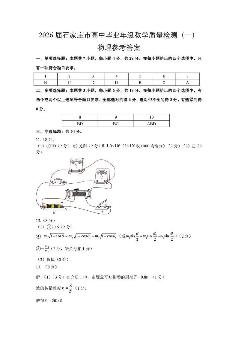 2026届石家庄市普通高中学校毕业年级教学质量检测(一)物理答案.pdf