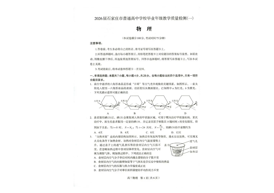 2026届石家庄市普通高中学校毕业年级教学质量检测(一)物理.pdf