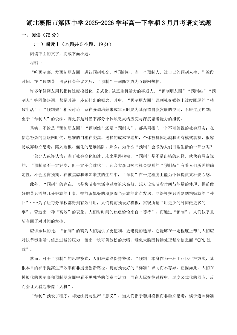 湖北省襄阳市第四中学2025-2026学年高一下学期3月阶段检测 语文.docx