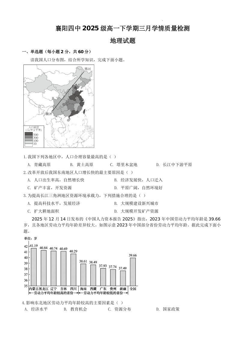 湖北省襄阳市第四中学2025-2026学年高一下学期3月阶段检测 地理试题(含答案).docx