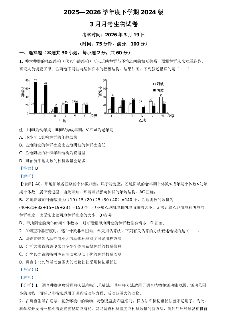 湖北省荆州市沙市中学2025-2026学年高二下学期3月月考 生物答案.docx